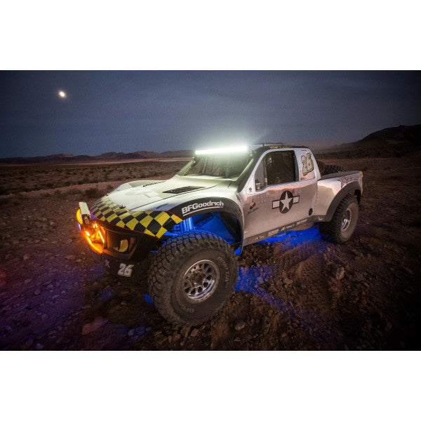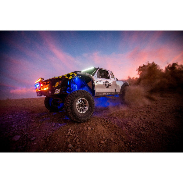 The RIGID Rock Light Kit uses the power and durability of A-Series LED lighting and adds custom 15 foot leads on each light, switch and angled mounts to light up the undercarriage of any truck, Jeep, or all-terrain vehicle. This kit will allow you to light up the trail with strategically placed lights on the vehicle. Perfect for night rock crawling, the LED lights are available in a variety of colors, including white, red, blue, or amber to aid night vision or accent vehicle colors. RIGID Rock Light Kits are available in 4-light or 6-light configurations to enhance and customize your night crawling experience. Own The Night with the original LED Rock Light Kit.